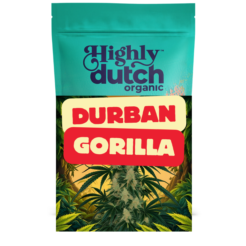 Pheno hunted Organic Durban Gorilla thrived in the jungle-like climate of the Highly Dutch Organic greenhouse, where rainwater, sunlight, and living soil nurtured its big, frosty potency. This indica-dominant cross of Ethos Glue and Mimosa may lack opposable thumbs, but it delivers a fruity, floral flavour with cereal notes. A banger.